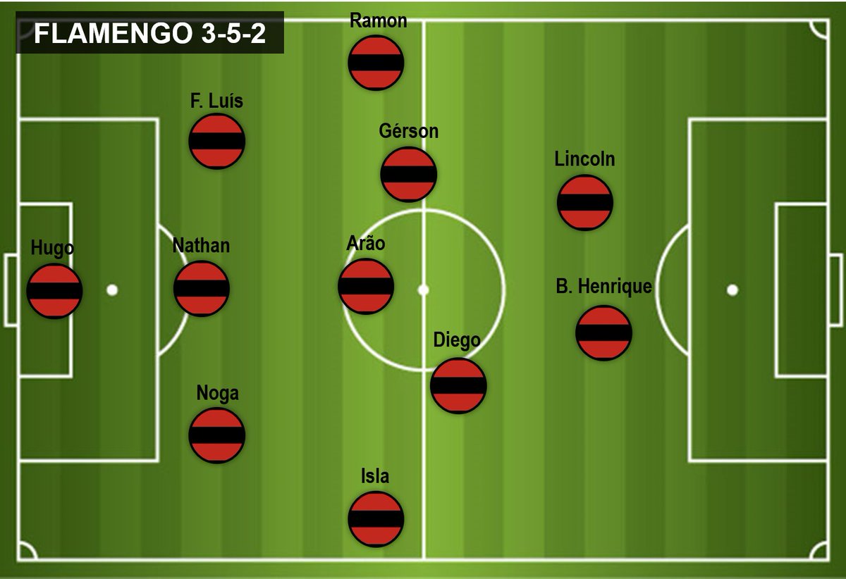 O 4-2-3-1 ganha cada vez mais sequência no Flamengo. Apesar do retorno dos laterais titulares, o Fla não tinha Thiago Maia poupado por desgaste físico. Assim, a dupla de volantes teve Arão e Gérson. Na linha de meias, BH na esquerda, Vitinho na direita e Arrascaeta por dentro.