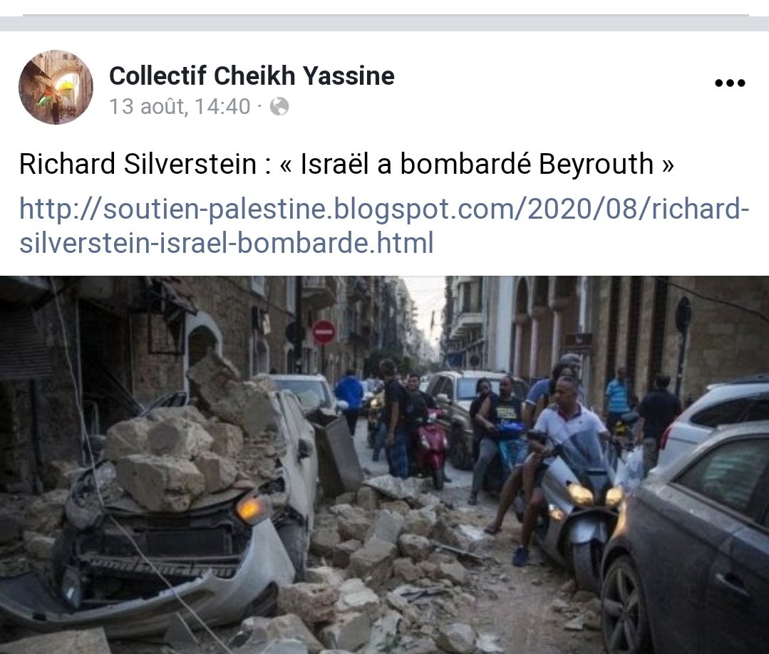 Cette organisation verse dans le plus haut niveau de fanatisme antisioniste et de complotisme: ici ils relaient un "article" qui affirme qu'Israël est responsable de l'incendie du port de Beyrouth.
