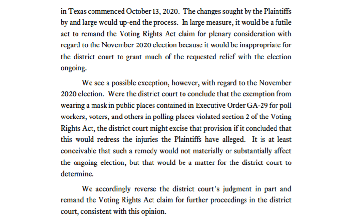 The TX lawsuit sought many items of relief, all of which the district court and 5th Circuit rejected EXCEPT for the plaintiffs' claim under the Voting Rights Act for a mask mandate at polling places.