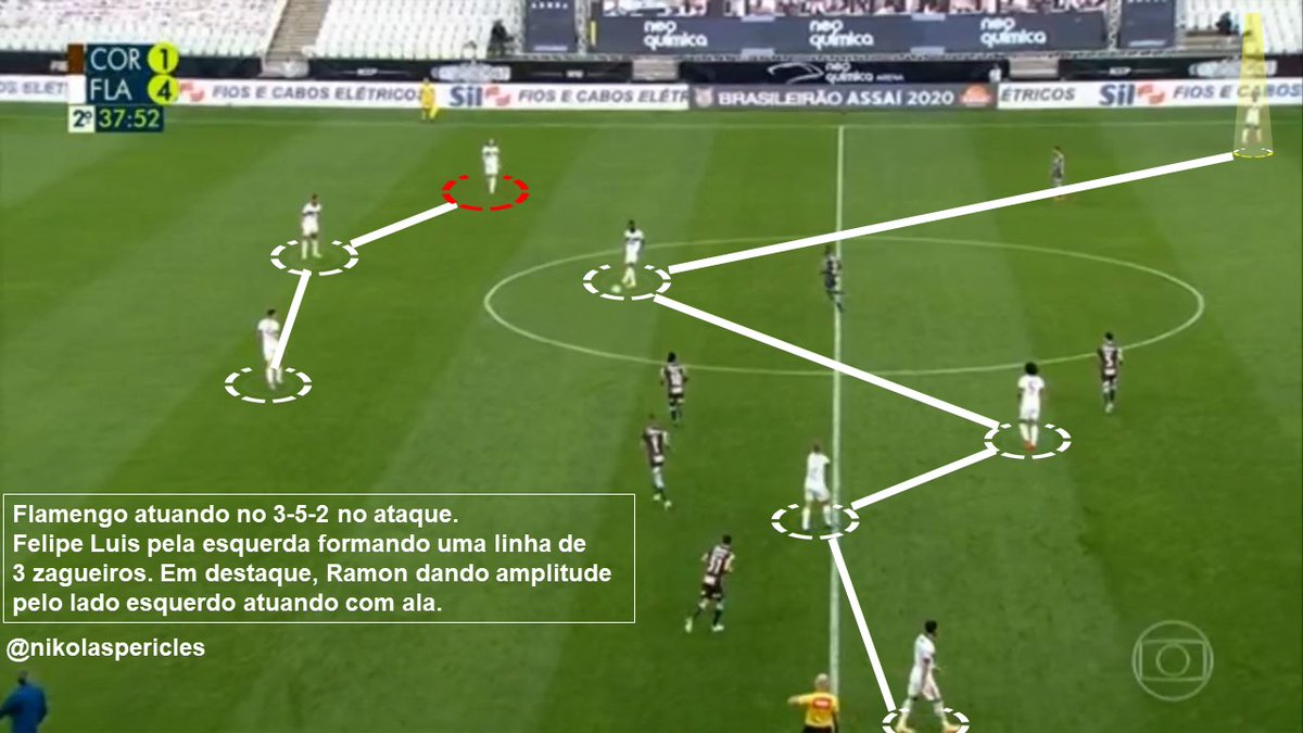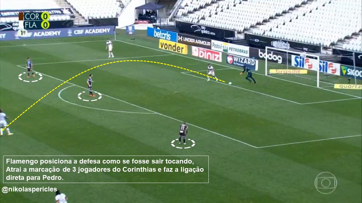 (1) Sabendo da ótima capacidade de domínio do Pedro e o recurso que ele possui para fazer o pivô, o Flamengo atraía o Corinthians para o entorno da sua área, e fazia a ligação direta para Pedro.