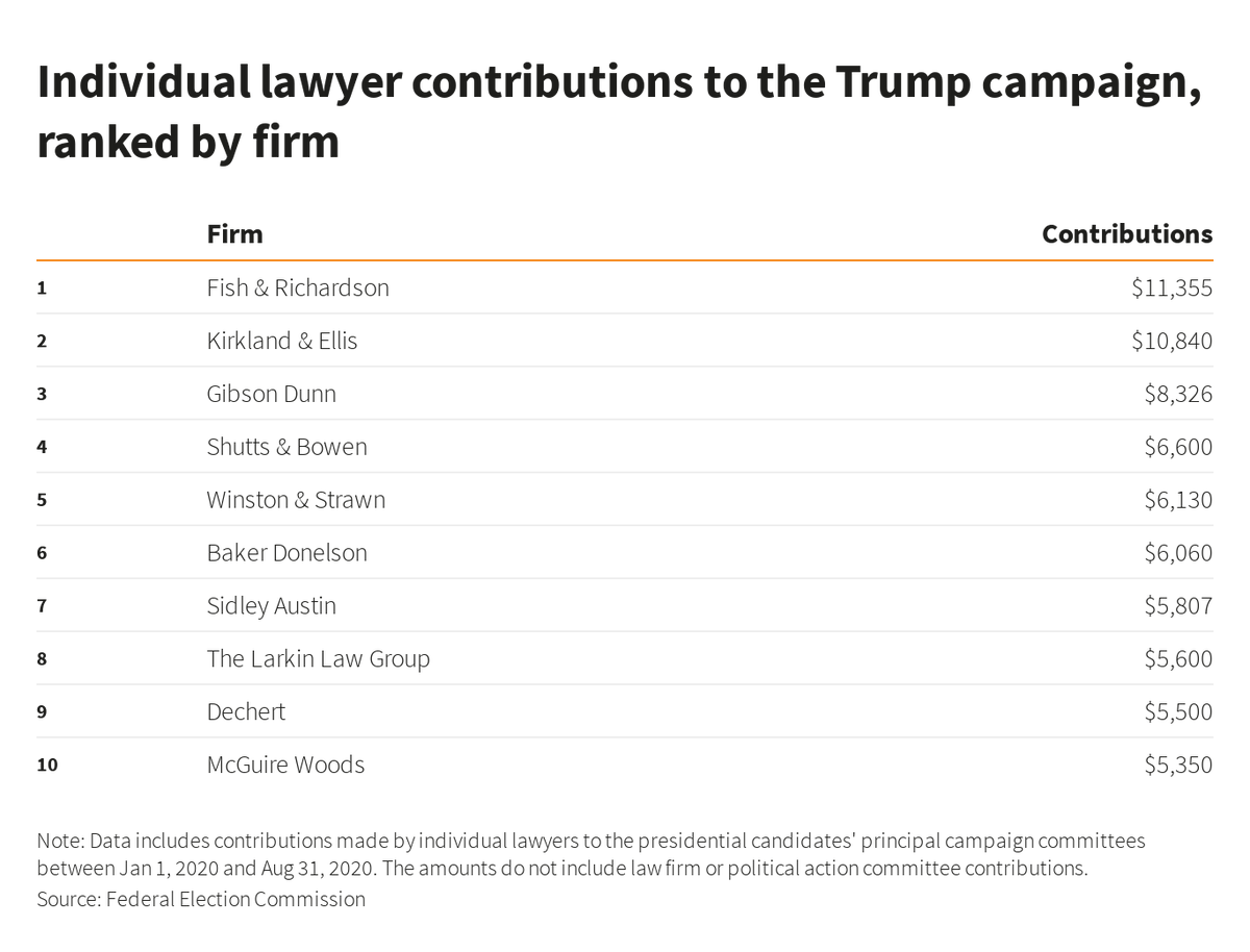 The firms whose lawyers have donated most to Trump’s re-election campaign are Fish & Richardson, Kirkland & Ellis and Gibson, Dunn & Crutcher reut.rs/3jfDaRy