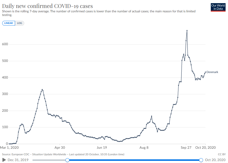 This is the situation we currently have here in Denmark. After a period of massive increase (R > 1), we have now ended up with a similar level of new infections per day.
