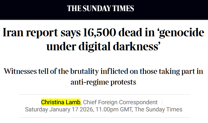 the new Sunday Times atrocity propaganda piece that ups the number of killed in Iran to 16,500 and adds the additional bombastic deranged claim of over 330,000 injured, was produced by Christina Lamb, who was the main instigator of the October 7 rape genocidal atrocity propaganda hoax. It is filled with the most insane lies that have been proven false, including that she personally saw video and photo footage of rape, the lie from rape-hoaxer Shari Mendes that she saw a fetus cut from a womb, and all the other ZAKA pedophile cult hoaxers with their pregnant women being cut open and knives and nails in vaginas.