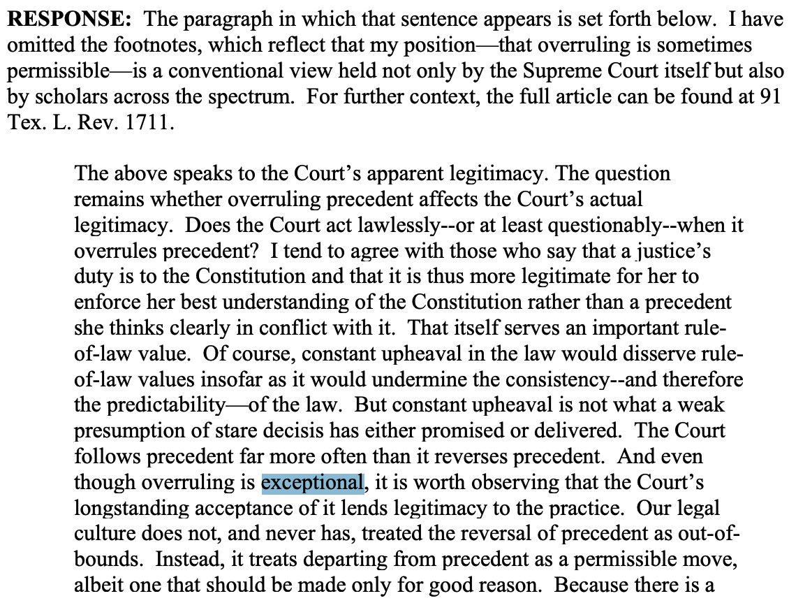 This is a bit misleading. In the article, "overruling is exceptional" was just a descriptive claim that the Court rarely overrules its past decisions. It wasn't a prescriptive claim about when the weak presumption of stare decisis is overridden. Still interesting, though.