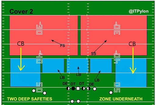 na cover 2 regular, o fundo do campo é dividido em metades, uma para cada safety, as flats ficam para os Cornerbacks sobrando 7 jogadores para cobrirem as demais áreas intermediárias e fazerem o pass rush