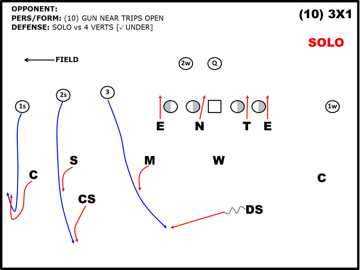 o gatilho da leitura será relacionado se o receiver de dentro vai fazer uma rota verticalmente ou vai atacar a flat, caso ele ataque a flat, o CB fica responsável pelo slot /TE e o Safety fica com o Wr de fora, caso o #2 vá para o fundo, fica na responsabilidade do S