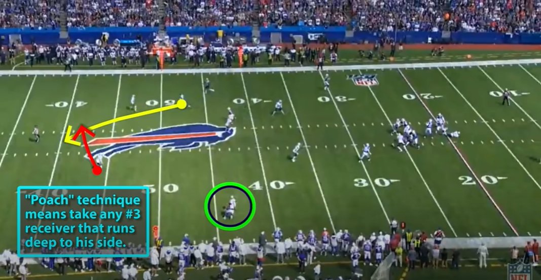 O safety do lado fraco joga em Poach Technique, que consiste em ele na pular na rota caso o WR#3 for para lado que só tem 1 WR, ou se só existir 1 rota funda ele pode cortar por baixo essa rota já que ele não tem responsabilidade do lado isolado
