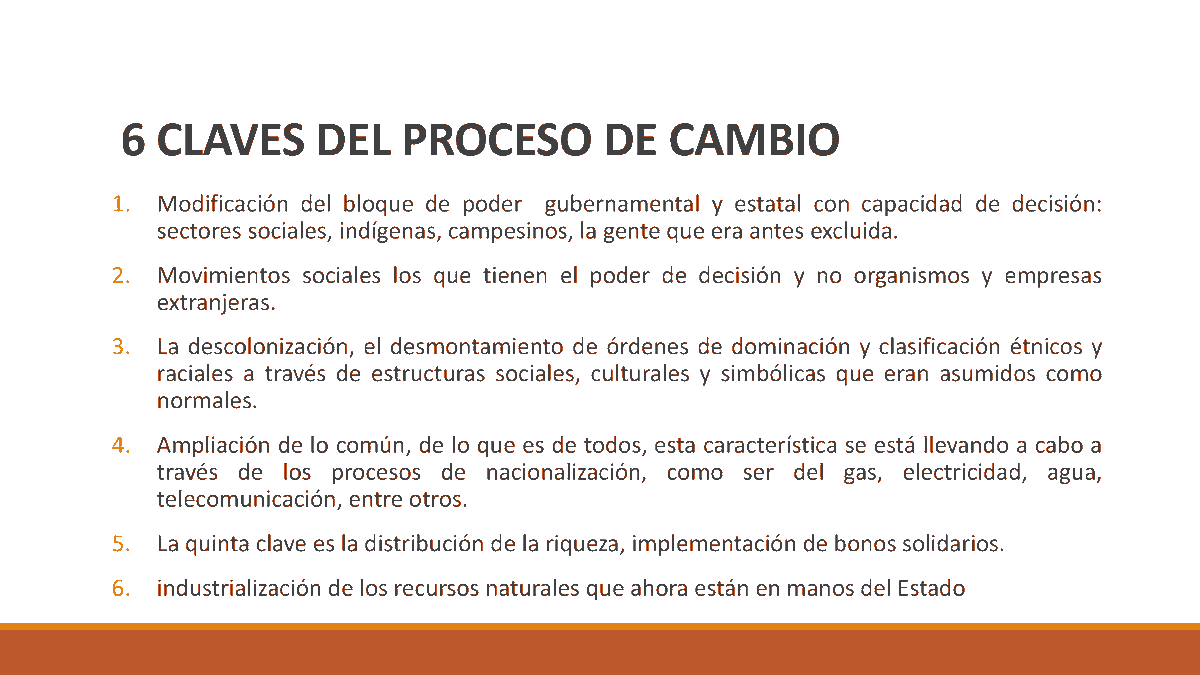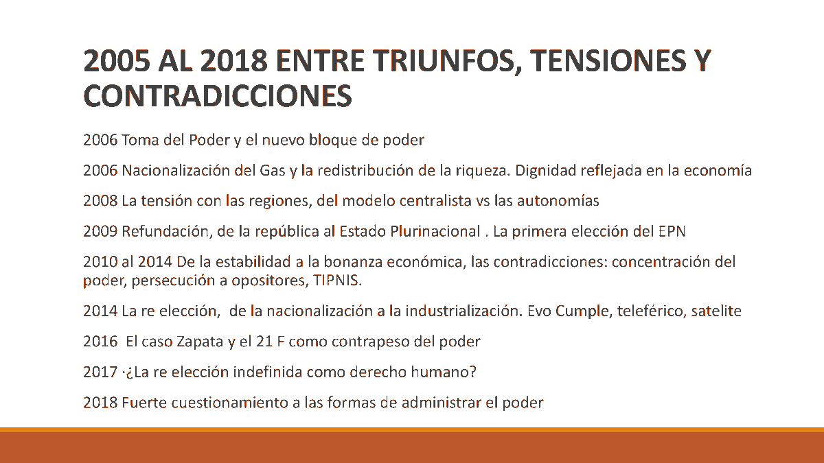 El MAS logra una mezcla de izquierda urbana y rural con el sindicalismo en conjunto con lo étnico que articula un discurso antiimperialista y antineoliberal. El proceso de cambio se vincula a la instalación del MAS en el poder con un horizonte de futuro que plantea 6 claves👇