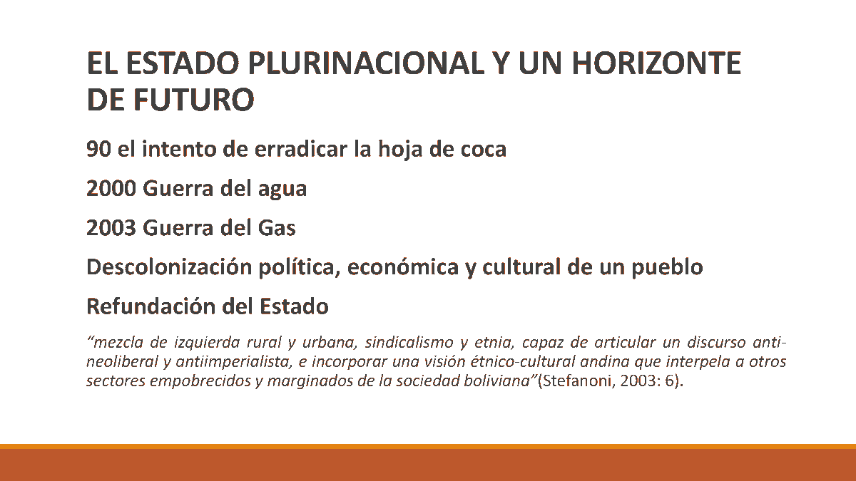 Esa imagen es compleja y se construye desde tensiones previas que permiten el discurso del Estado Plurinacional. La lucha por la hoja de coca, la guerra del agua y del gas, marcan movimientos de insurgencia popular contra el Estado privatizador en desmedro de lo nacional #compol