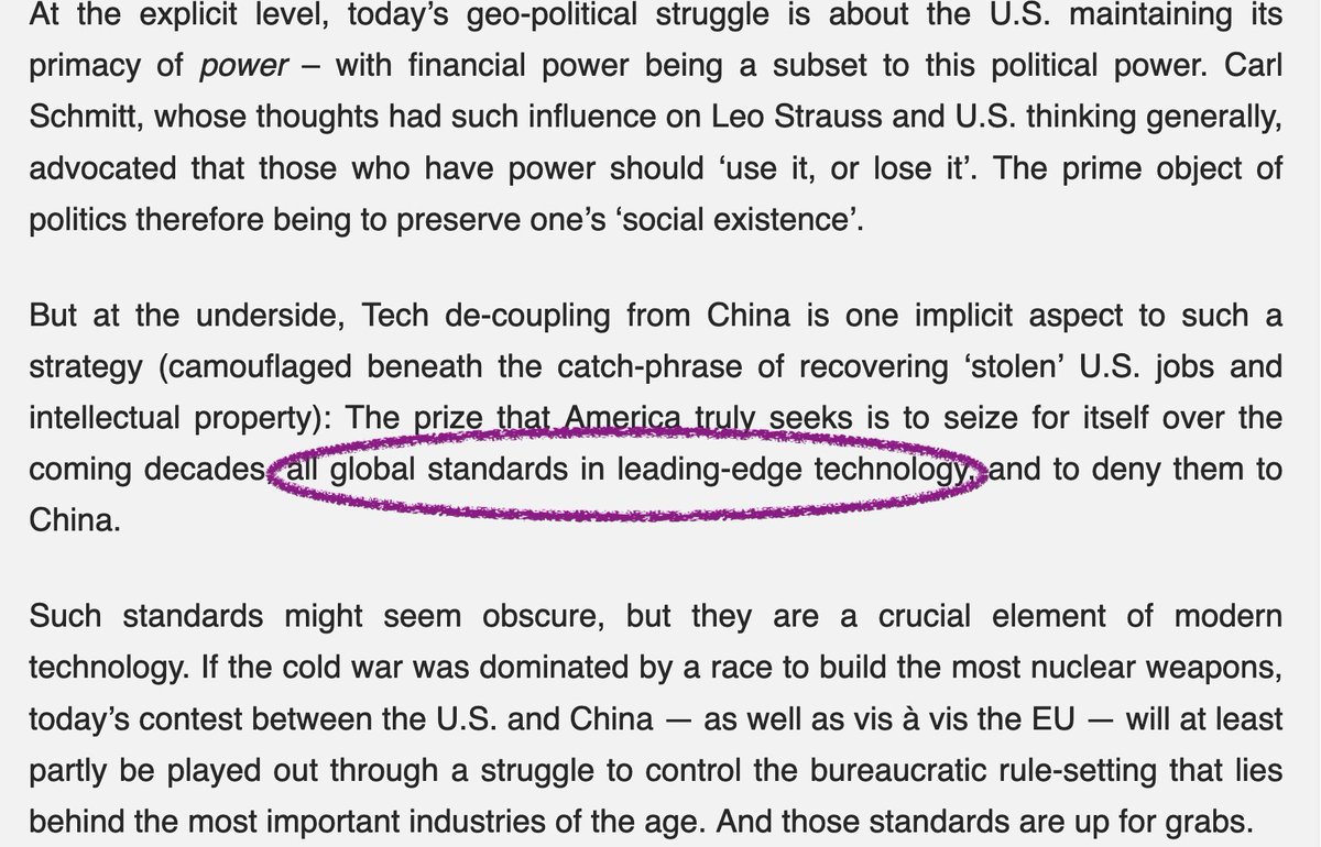 💥 "The prize that America truly seeks is to seize for itself over the coming decades, all global standards in leading-edge technology, and to deny them to China.” 👈 👆