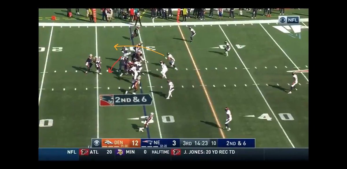 Nessa jogada NE usava uma power option, que é uma corrida em que o QB lê o Edge marcado em azul. Se ele atacar o RB na lateral, o QB fica com a bola e corre pelo meio, se ele atacar o QB pelo meio, ele entrega a bola pro RB correr pela lateral.