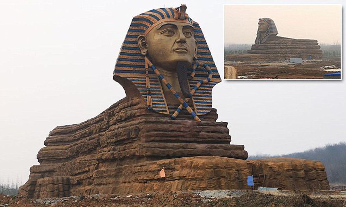 Lalu Mesir memprotes patung Sphinx yg persis dgn Sphinx di Giza tsb. Beijing suruh bongkar. Ternyata pembuatnya membandel, dia mengubah muka Sphinx, dari yg hidung terpotong karena rusak, jadi Sphinx seperti aslinya jaman Mesir Kuno.😆😆