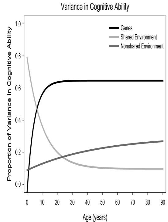 The finding that environmental variance in some traits is explained only by non-shared environments, and not at all by shared environments, is, while true, very confusing given that environments all presumably impact the same factors in the brain whether they are shared or not...