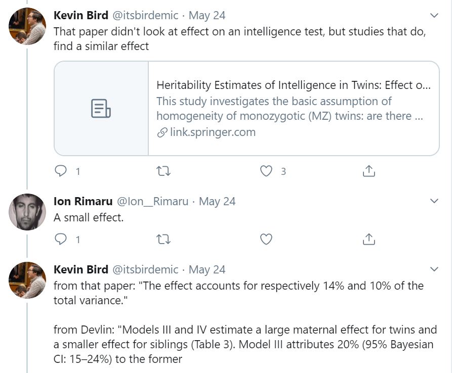 -Kevin Bird shows up to cite old research with an inferior sample size as showing that there is a pre-natal bias that explained 14% and 10% of the variance in IQ similar to the estimates of Devlin