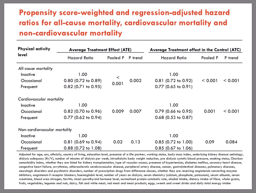 The association between self-reported #PhysicalActivity & mortality in a very large cohort of people receiving hemodialysis - The Diet-HD Cohort Study (PO1038). #KidneyWk