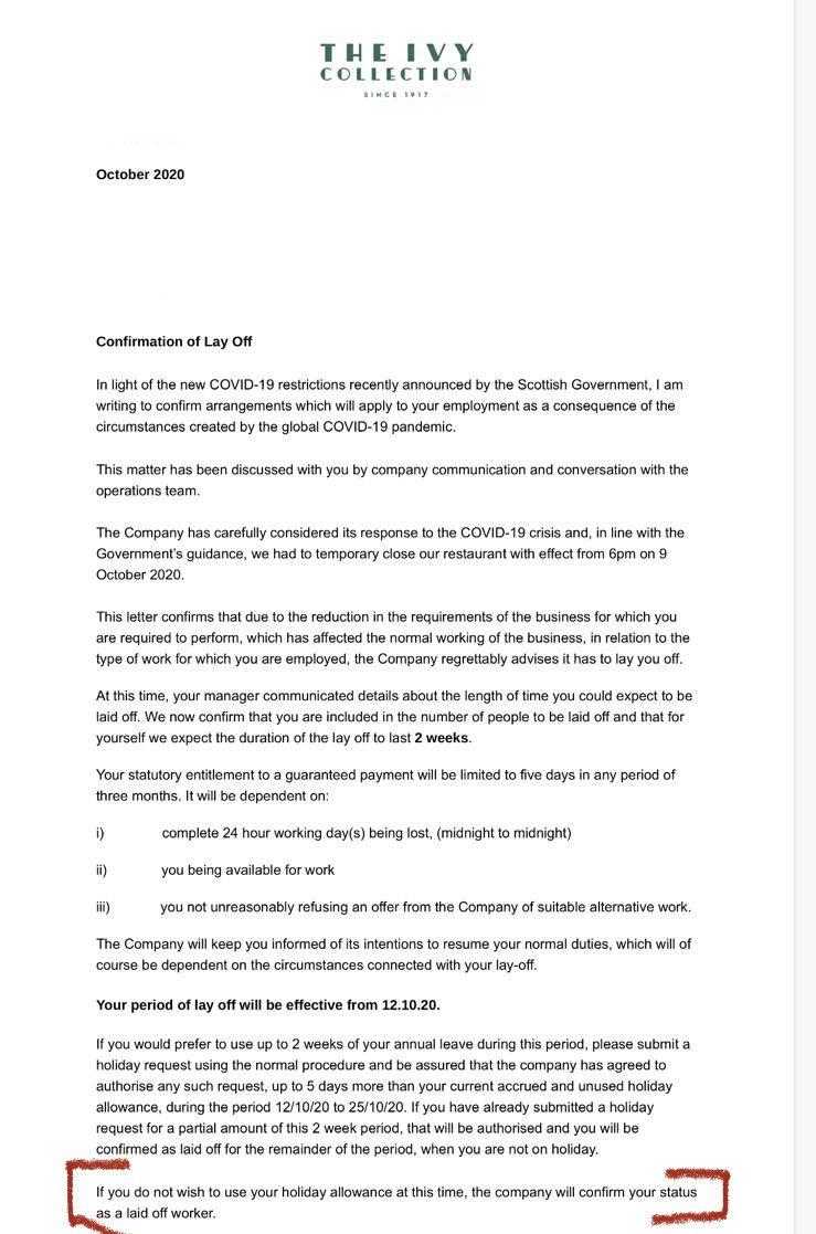 We’ve seen a letter from The Ivy to some workers that confirms that unless those staff use their holiday allowance they will be temporarily laid off.