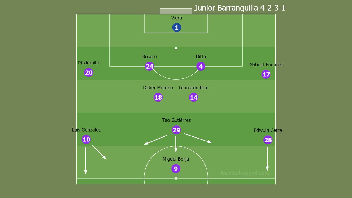 O Junior Barranquilla veio jogando da forma que tínhamos antecipado no mapa da mina, em um 4-2-3-1, com Teo Gutiérrez na armação das jogadas, chegando na área e Borja na referência do ataque.