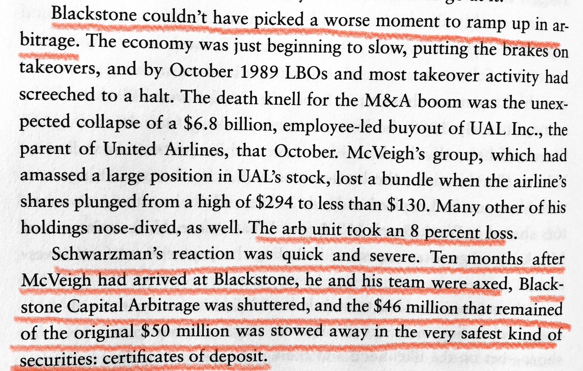 2. En 1989, Blackstone eligió el peor momento para crear un departamento de arbitraje y dotarlo con $50M. Con el crash bursátil de octubre perdieron un 8%. Scharzman la cabeza a todo el equipo