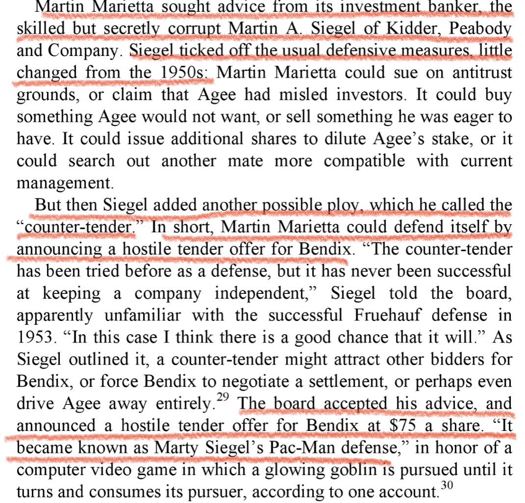 Un pequeño inciso sobre Martin Siegel, leyenda de Wall Street. Inventó la defensa Pac-Man cuando asesoraba al conglomerado industrial Martin Marietta contra el intento de compra hostil por parte de Bendix Corp (1982).