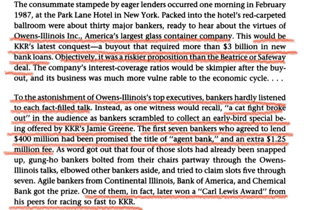 La compra de Beatrice (corporación dueña de marcas como Avis, Samsonite, Tropicana y Playtex) por KKR (1986) fue en su momento el mayor LBO de la historia ($6B). Los banqueros (y el propio KKR -“Yo soy el banco de inversión”-) se repartieron $248M en honorarios, algo nunca visto