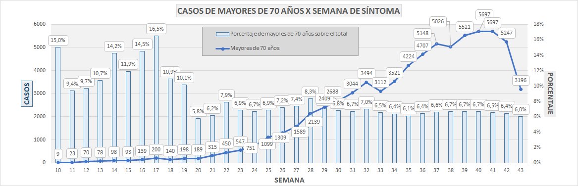 Cantidad de fallecidos y su edad media, y fallecidos mayores de 70 años por semana de inicio de síntoma.