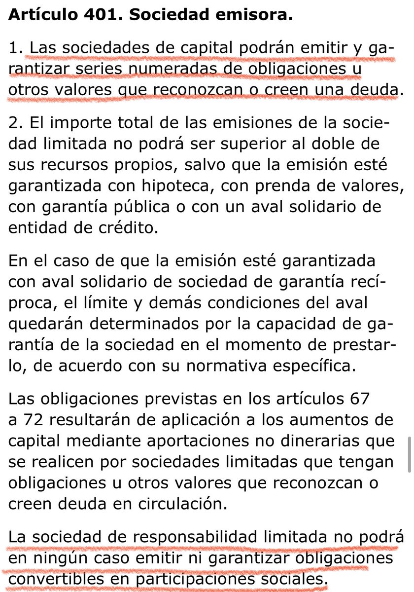 Si bien tras la reforma de la Ley 5/2015, las sociedades de responsabilidad limitada (SL) españolas pueden emitir deuda titulizada (obligaciones), el art. 401.2 LSC les prohibe expresamente emitir obligaciones convertibles en participaciones sociales