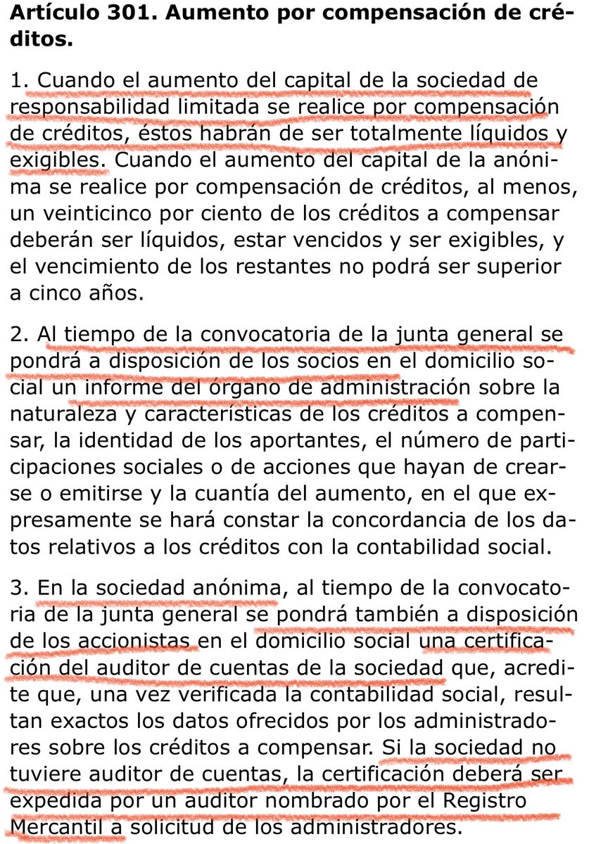 Y no lo es porque, en una S.L., para capitalizar créditos (deuda) solo necesito un informe de administradores identificando los créditos (líquidos, vencidos y exigibles), su existencia y el número de participaciones a entregar a los aportantes (art. 301 LSC)