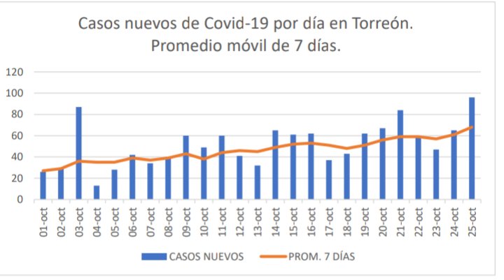 Ante el aumento d casos d #COVID19 en #Torreón, es importante notar q por varios eventos sociales del fin d semana pasado, el repunte puede ser mayor en los próximos días.