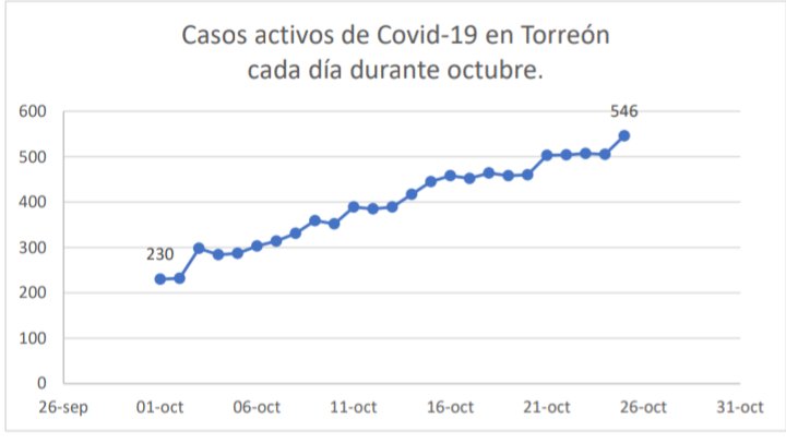 Los casos activos de #COVID19 en #Torreón cada día han aumentado 137% en lo que va de octubre, de 230 a 546.