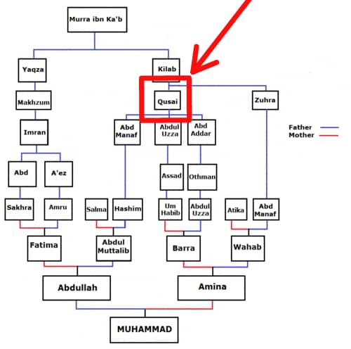 They were a perfect match, made in heaven. Their likes and hates were similar. Historians say their genealogy meets at Qusayi. She was Khadija bint Khuwaylid bn Asad bn 'Abdul-'Uzza bn Qusayi.