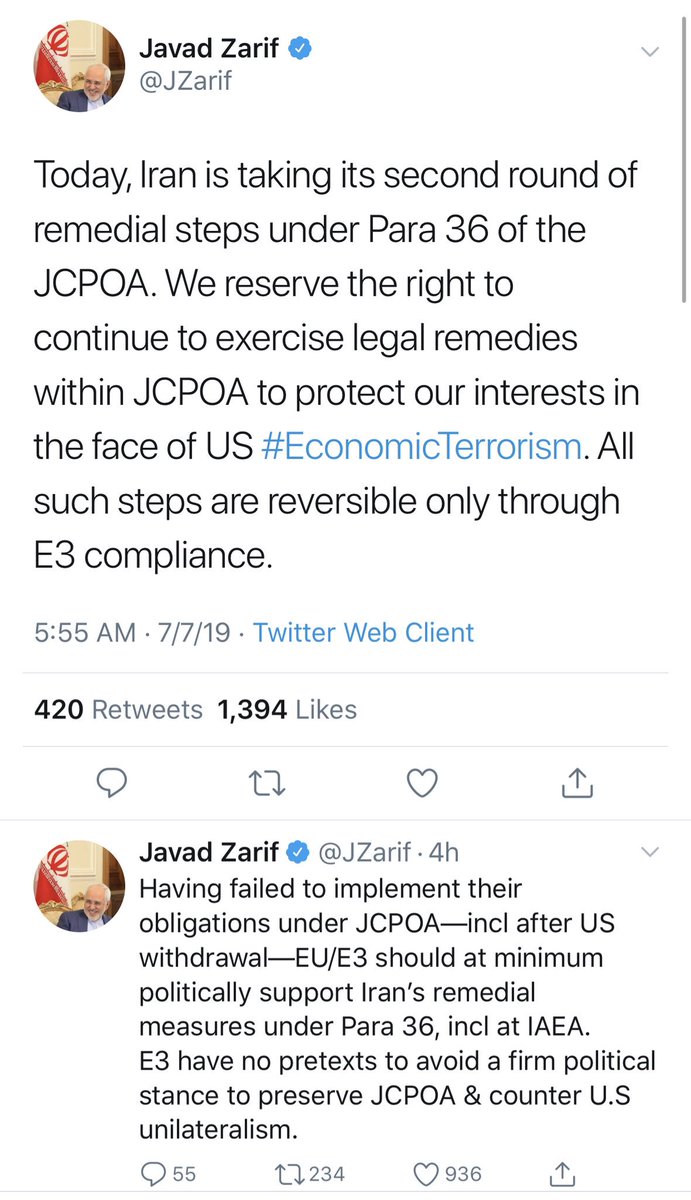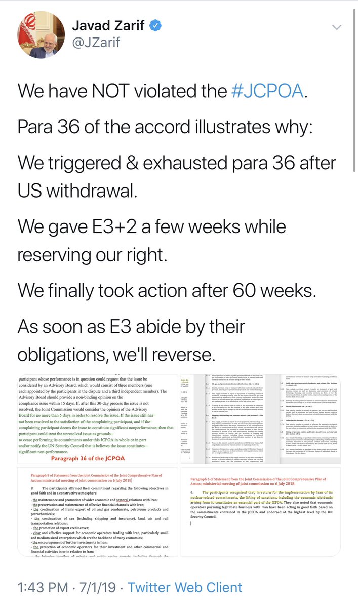 Mohammad Javad Zarif is unserious. He references “paragraph 36” as though it is the entirely of the JCPOA & it somehow licenses illegitimate Iranian enrichment activities. He’s also lying about Iran triggering and exhausting para 36. It never happened.