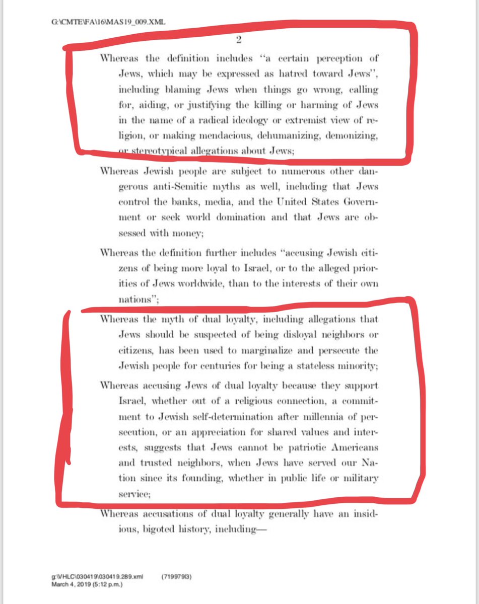 ”WHEREAS THE MYTH OF DUAL LOYALTY, INCLUDING ALLEGATIONS THAT JEWS SHOULD BE SUSPECTED OF BEING DISLOYAL NEIGHBORS OR CITIZENS, HAS BEEN USED TO MARGINALIZE AND PERSECUTE THE JEWISH PEOPLE FOR CENTURIES FOR BEING A STATELESS MINORITY;”