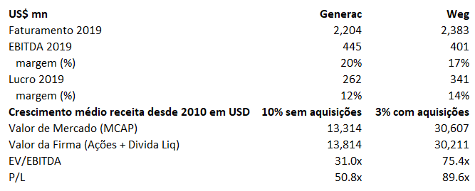 2. Hoje a Generac é focada em geradores de energia, principalmente geradores "standby" que são acionados no momento de uma queda de energia. A Weg também produz geradores, mas seu negócio como um todo é mais diversificado. Curiosamente, as empresas tem vários aspectos em comum.
