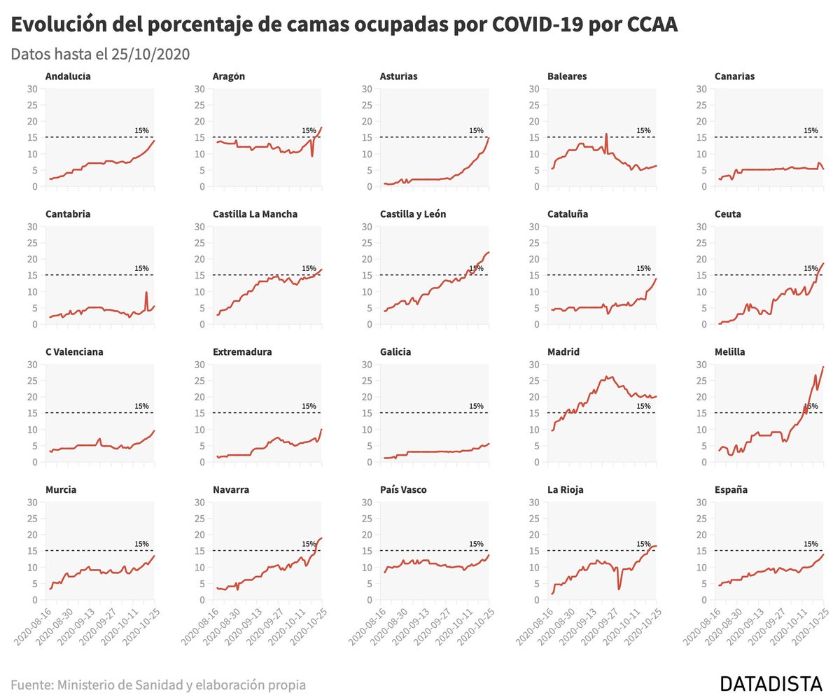 Evolución de camas ocupadas por COVID-19 respecto al total de hospitalizados. Hay 16.008 personas ingresadas con 2.031 en UCI. 734 altas en 24h