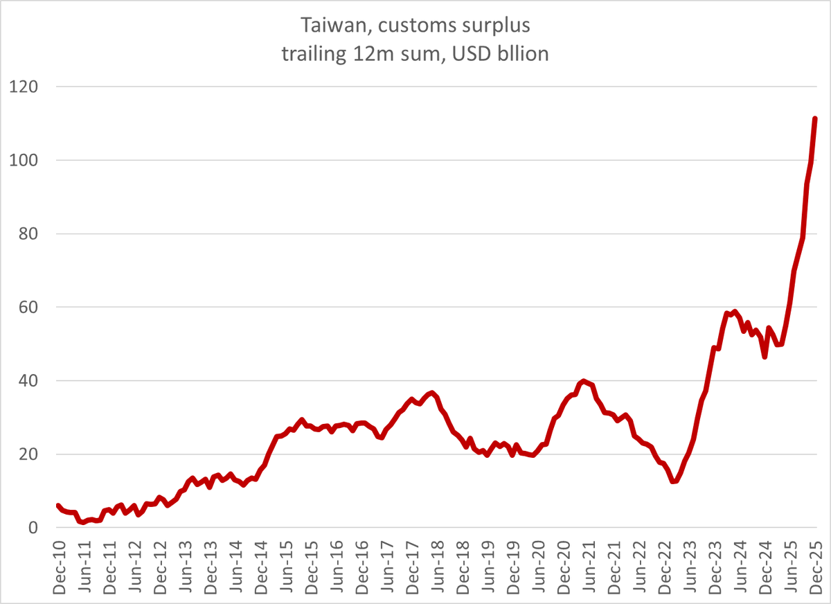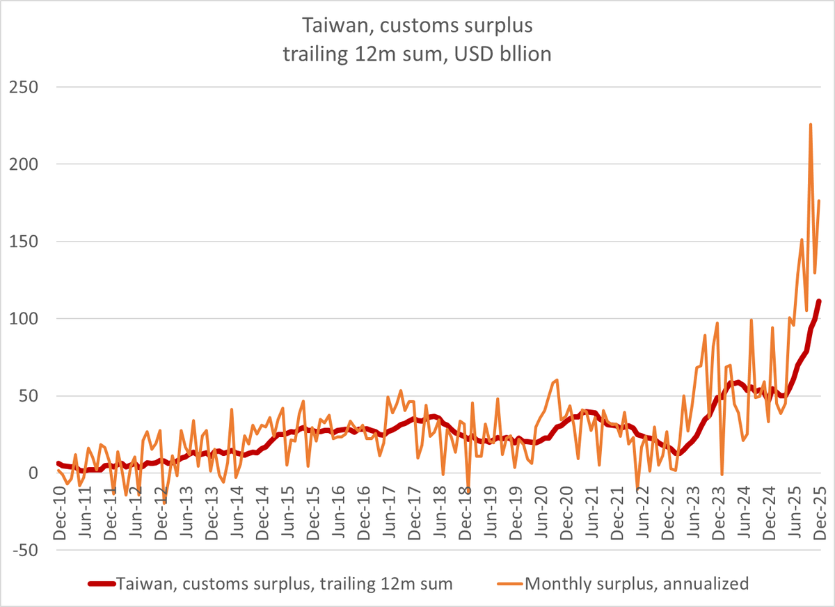 for the year, Taiwan's surplus will more than double -- from ~ $50b to over $100b. and the q4 surplus annualized is WAY higher, at around $175b. That is a crazy number for a country that already had a bit external surplus and has a lot of investment income
