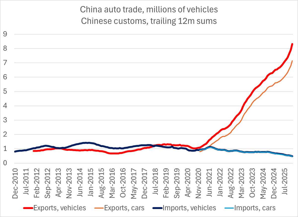 Very strong December for China's auto exports. Vehicle exports for the month were close to 1 million -- and I estimate passenger car exports will come in at 850K for the month, or a 10m annualized pace