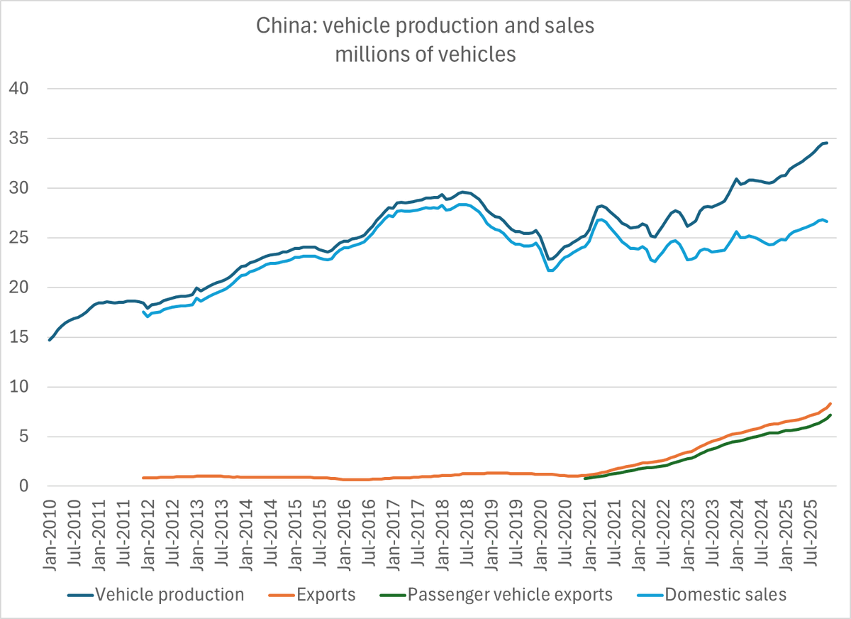And as this chart shows, the rapid development of the export sector (net exports of passenger cars were zero in 2020, and will be ~ 6.5m in 2025 with a much higher number for q4) has driven the overall increase in China's auto production, not d demand