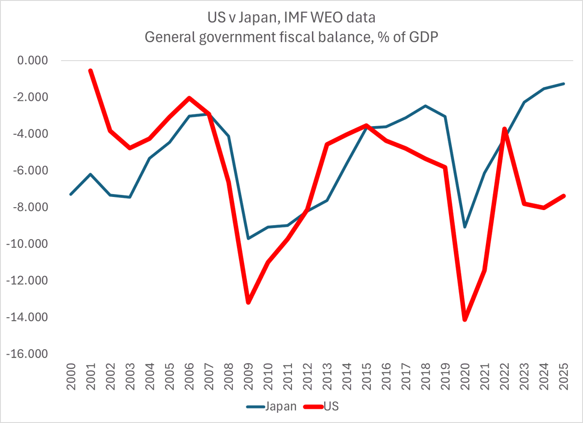 Maybe the IMF's data is off, but it has the general government deficit in 2025 at under 2 pp pf GDP (way better than the US) and it likely would be ~ 2% of GDP even with Takaichi's 0.7 pp of GDP(?) stimulus