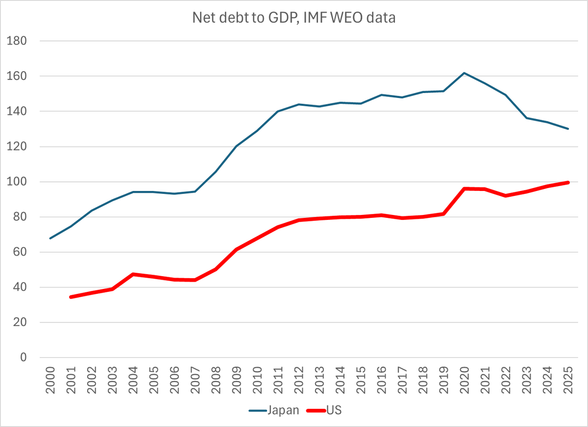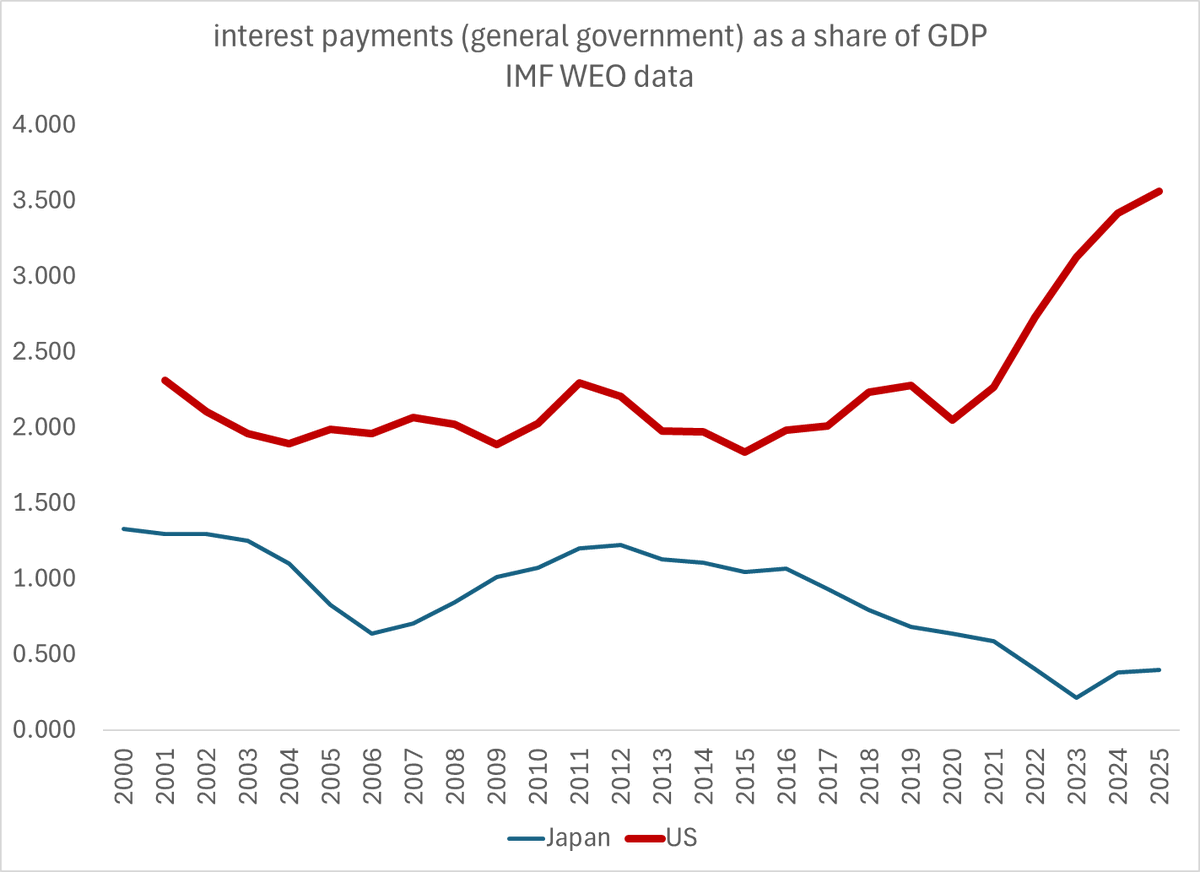 Net debt is much more clearly on a downward trajectory than the US -- and the net interest bill is very modest comparatively (even with high gross debt); it will get worse JGBs are refinanced but there is room to give a bit ...