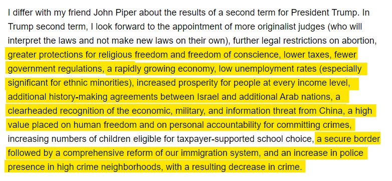 Grudem does not mention Trump's incompetent, compassionless handling of the pandemic. He also does not mention his odd deference to Putin. He does not mention his separation of children or reduction in the number of asylum seekers accepted. He does not mention the poor.