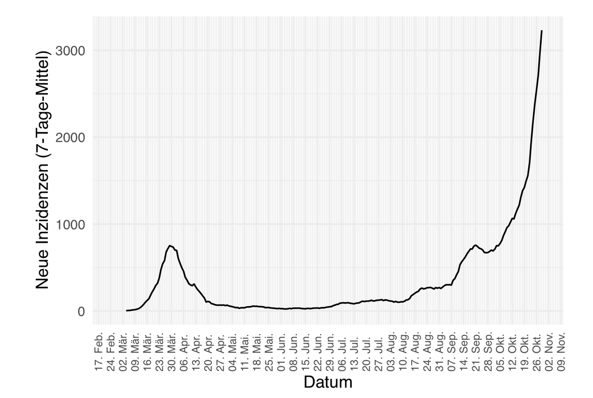 Täglich berichtete positive Tests - logarithmische Skala. Man beachte die Krümmung nach oben am Ende der Kurve. Das bedeutet, dass die Zunahme stärker als exponentiell ist.