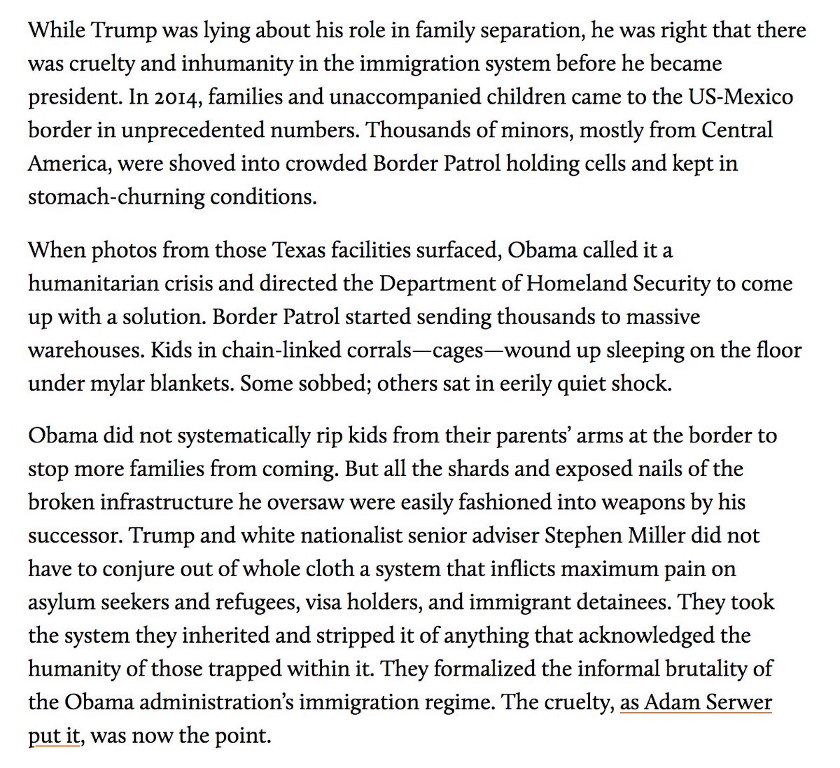 3/ There was cruelty and inhumanity in the immigration system before Trump became president. But when he and white nationalist senior adviser Stephen Miller took over, they stripped the system of anything that acknowledged the humanity of those trapped within it.