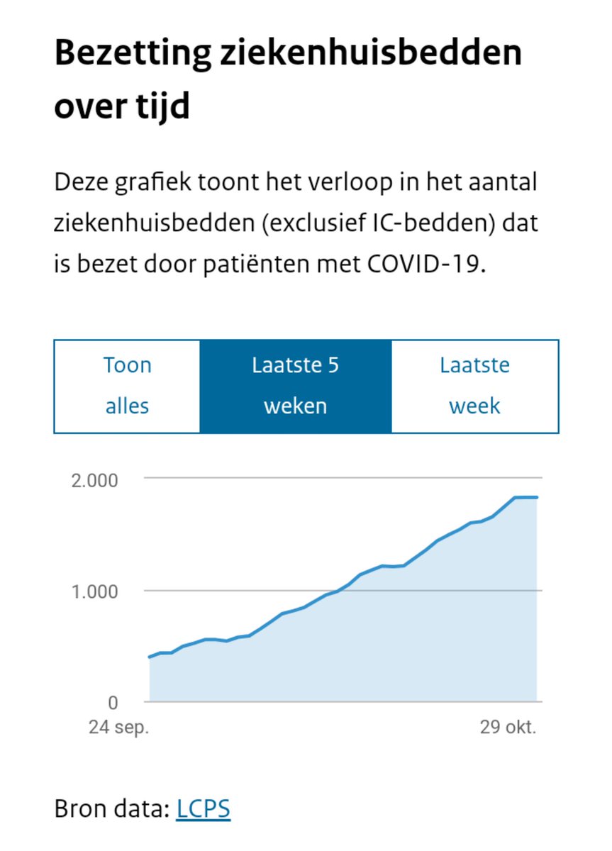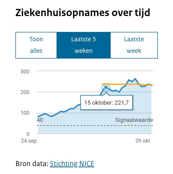 Het systeem om de cijfers bij te houden is verre van goed ingeregeld. De grafiek van ziekenhuisopnames die op 13 okt gepubliceerd werd, zag eruit als een continue stijgende lijn (die al enigszins afboog) met een piek op 10 okt van ca. 145 opnames/d.