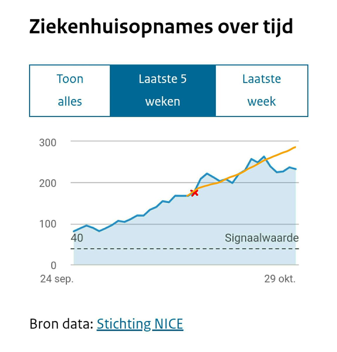 Kijk je vandaag naar de grafiek op het dashboard, dan is het aantal opnames dat voor 10 okt. genoemd wordt 168, ofwel 16% hoger. Er wordt dus nog behoorlijk 'gecorrigeerd' achteraf. Dat maakt op deze cijfers sturen natuurlijk vrijwel onmogelijk.