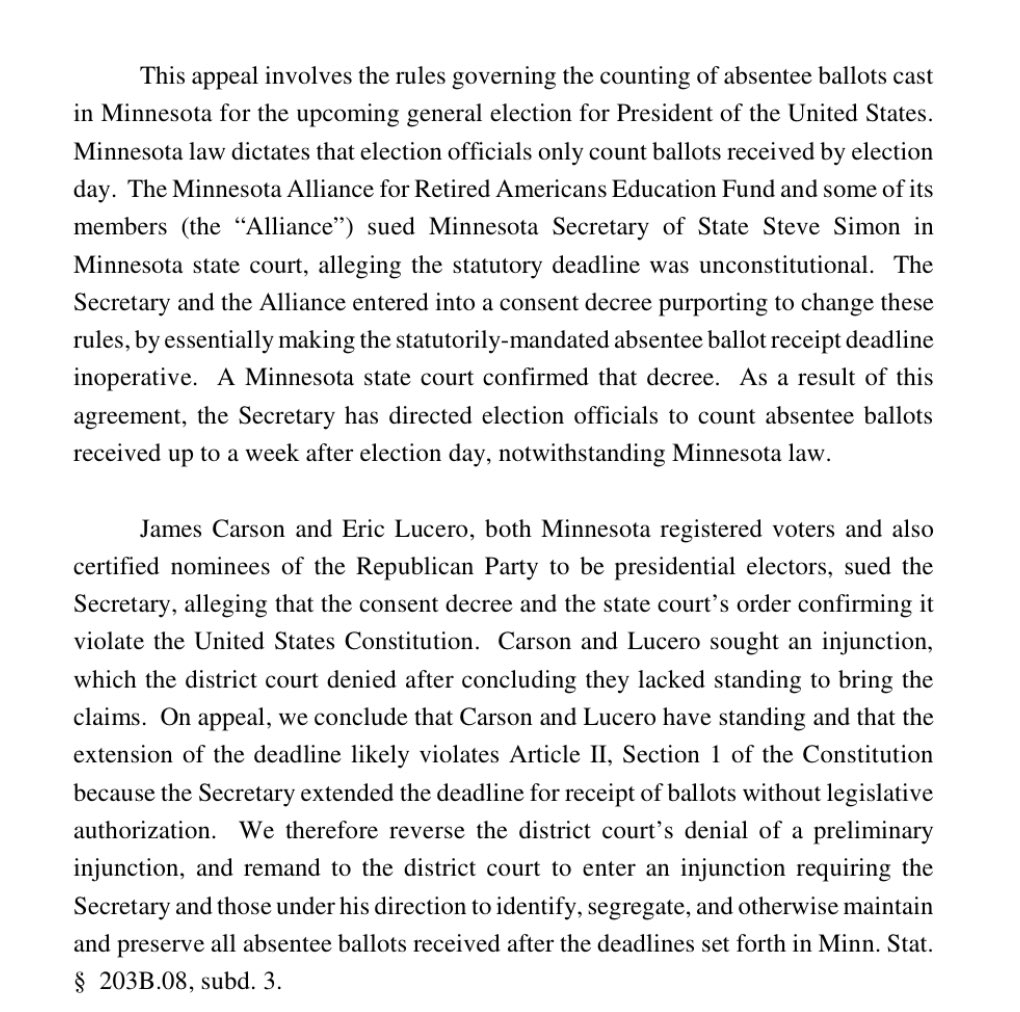 An 8th Circuit panel, petitioned by Republican electors, orders Minnesota to segregate absentee ballots received after 8pm on Election Day—reasoning that the state created a seven day grace period for receipt without legislative authorization. ecf.ca8.uscourts.gov/opndir/20/10/2…
