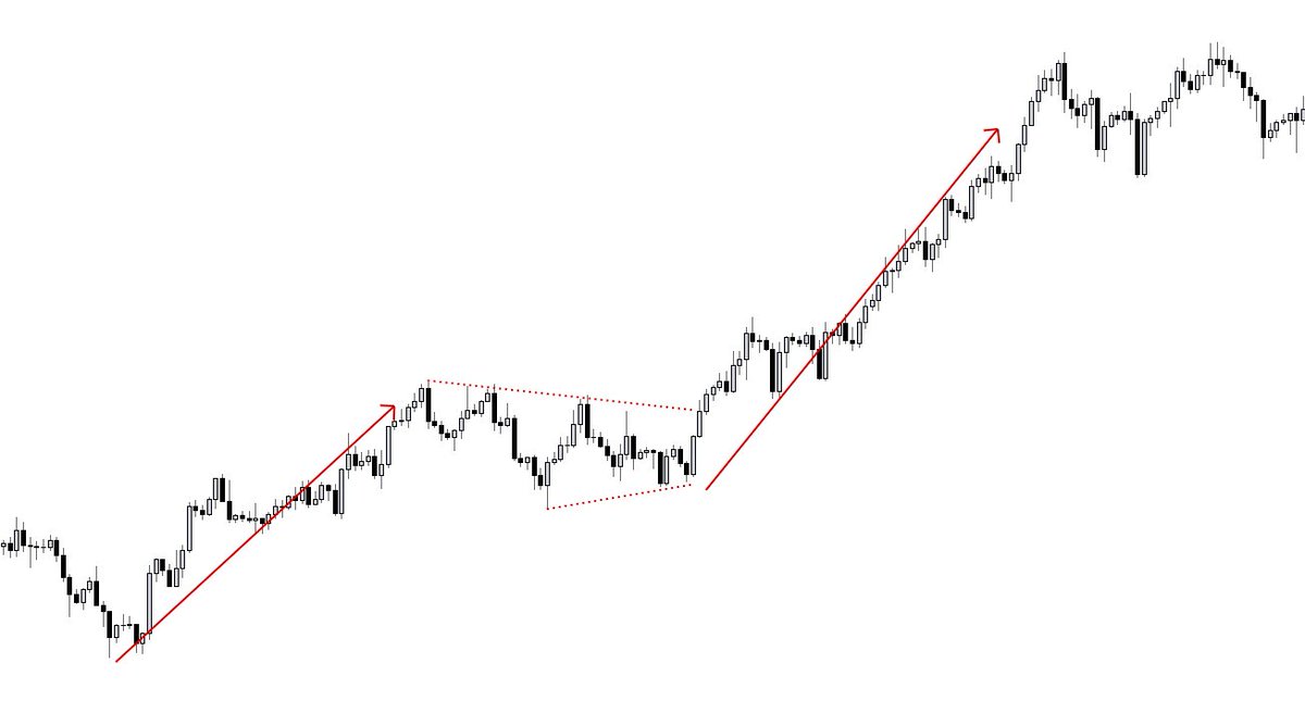 Her zaman aşağı yada yukarı gidecek diye bir kural yoktur, fiyat bazen sıkışabilir de. Bu durumda "genellikle" trendi devam ettirir, yani sıkışma öncesinde çıkmışsa çıkmaya devam eder, düşmüşse düşmeye devam eder.