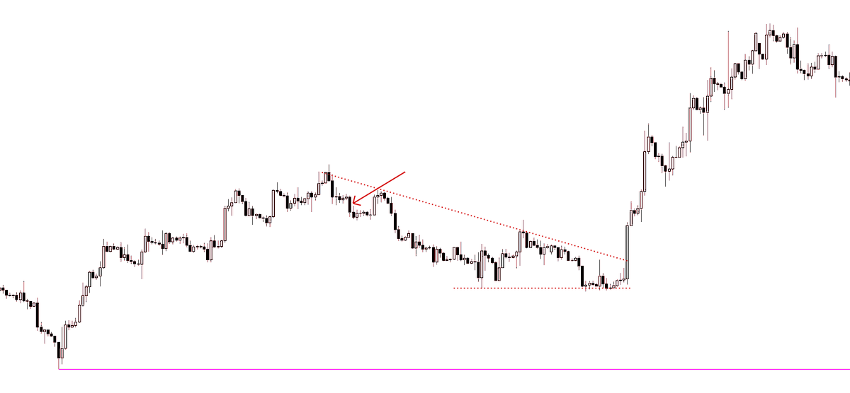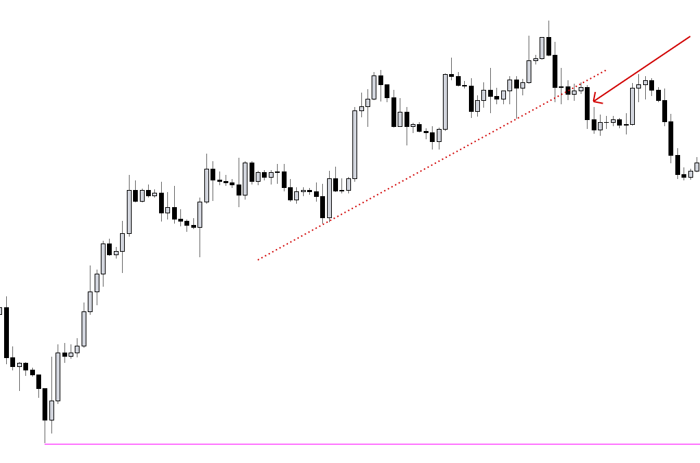 Yeni trendi takip etmek. Örneğin şu grafiği ele alalım ve ok ile gösterdiğim siyah mum'da olduğumuzu düşünelim. Yükselen trendimiz kırıldı. Peki aşağıdaki dip geçilecek mi? Bunu bilmiyoruz. Şimdi yapmamız gereken düşen trendi takip etmek.
