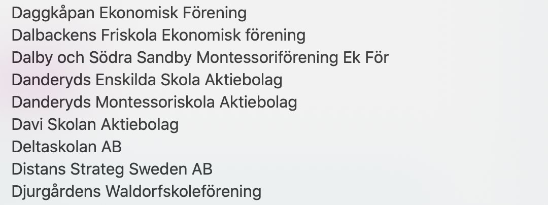 Vi kan börja med koncernen Dibber som var aktuell för några veckor sedan eftersom de försöker att tvinga elever att ha hälften av undervisningen på engelska. Dibber äger 14 skolor i Sverige. dibber.se/skolor/hitta-s…