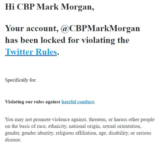 On the eve of U.S. elections, where candidates have significant differences on U.S. immigration policy, Twitter censorship shut down the account of U.S. Customs and Border Protection (CBP) Commissioner Mark Morgan.