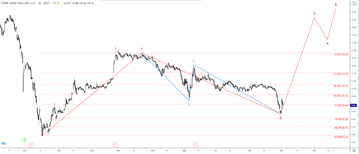 #thyao da trend çizgisine dikkat inebilir dedim 10.55'deyken. kırıldı ve 8.80'lere kadar indi. Biraz daha detaylı bakındım ve sayımda güncelleme yaptım. Şimdi ondan bahsedeyim biraz.++